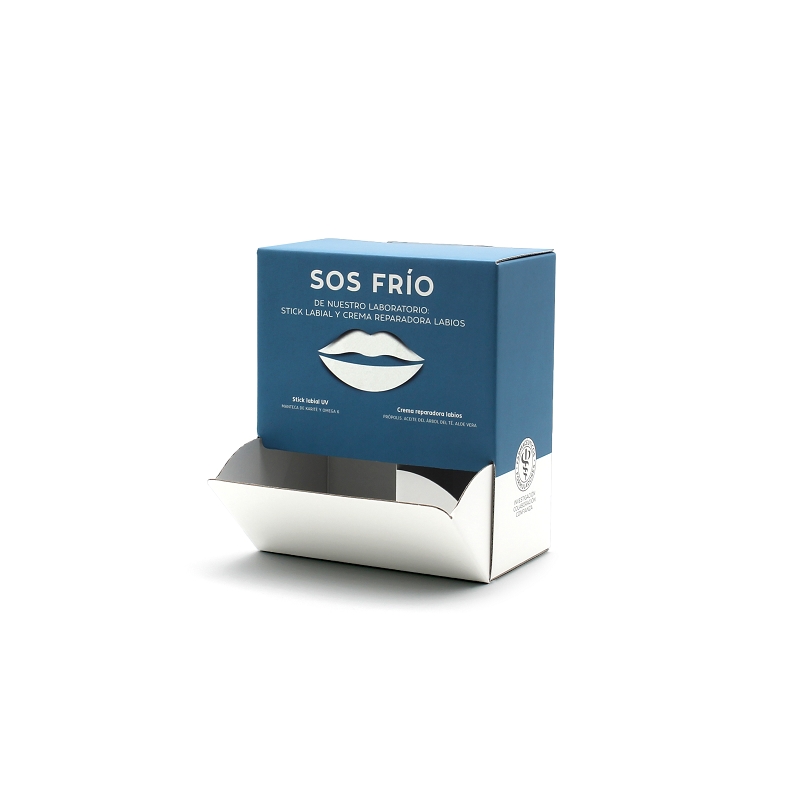 Un présentoir de comptoir sur mesure, conçu pour mettre en lumiere un stick lèvres d’hiver : au bon endroit, au bon moment, avec la juste visibilité.
